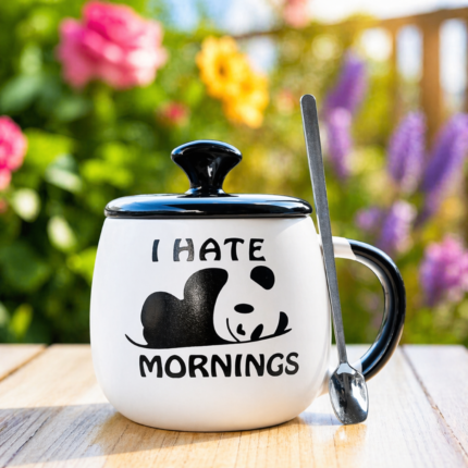 Panda I Hate Mornings Coffee Mug with Lid & Spoon – Ceramic Insulated Cup, Microwave & Dishwasher Safe, Gift Set with Keychain
